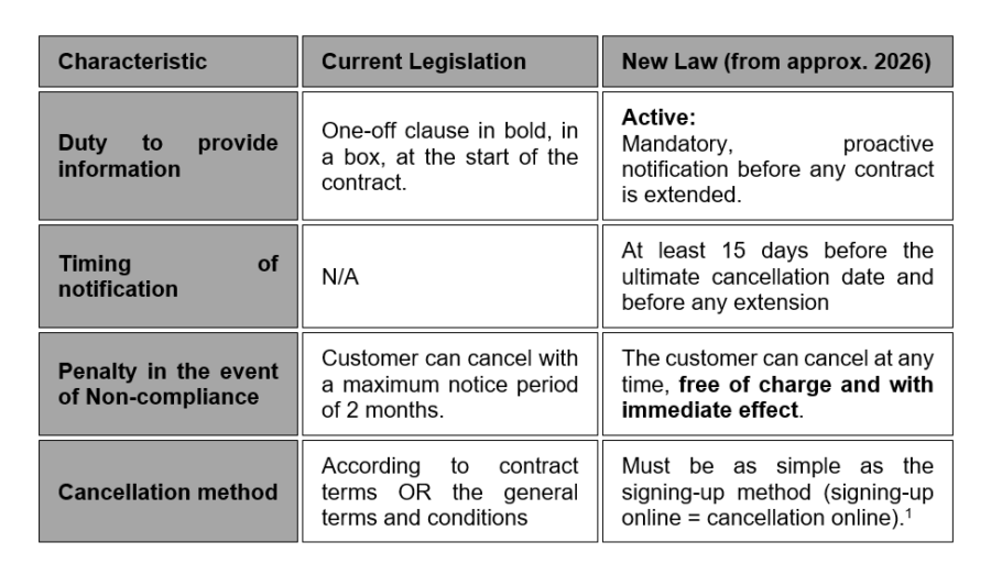 The thrust of the new law is the shift from a passive to an active obligation for companies to inform customers. Whereas previously a clause in the general terms and conditions was enough for the agreement to be renewed for x number of years if it was not cancelled in good time, you will soon have to personally and warn each customer in good time that a contract will soon be extended.